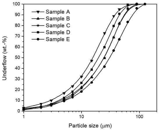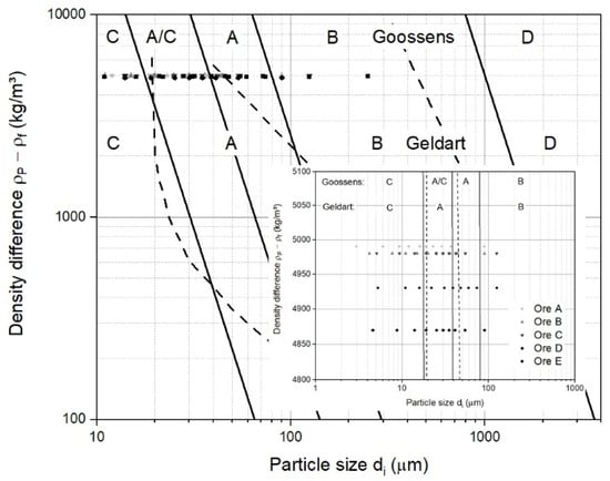 Based on the classification according to Geldart and Goossens, the five samples of iron ore ultra-fines from Table 1 are illustrated in Figure 3. The dots represent the particle diameter, , for every 10 vol.−% underflow interval of the particle size distribution, meaning the first dot d10 at 10 vol.−%, second dot d20 at 20 vol.−% underflow, etc., and the last dot d100 at 100 vol.−%. This form of illustration was chosen since the particle size distribution is not wholly represented by the mean particle diameter alone.