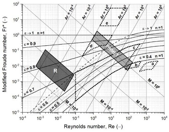 One characteristic of iron ore ultra-fines is the broad particle size distribution. To account for approximately 95 wt.−% of the total mass, the size range is primarily between 2 and 90 µm. For the process data, the temperature range was between 873 and 1173 K [4]. The pressure was defined with a 0.1 bar gauge to be slightly above ambient. The gas velocity followed Spreitzer and Schenk between 0.15 and 0.30 m/s for hydrogen mixtures with the extreme case of up to 80% H2O [29,47]. Figure 4 shows an extended version of the Reh diagram, including various gas–solid reactor systems (fields a to e), the FINMET® operating field, and the operating field R for the reduction of iron ore ultra-fines in a fluidized bed. The operating field R is circumscribed as follows: