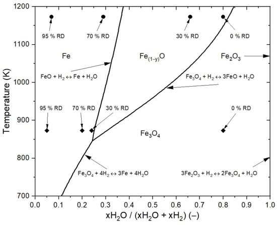 Accounting for the thermodynamic aspect, the whole process’ reduction temperature and gas composition can be calculated using the Baur–Glaessner diagram. In this diagram, the stability areas of the iron oxides are given by the temperature against the gas oxidation degree (GOD). For reduction with hydrogen, the GOD is defined by the gas composition as the ratio of water vapor to hydrogen and water vapor. FactSageTM 7.3 (Database: FactPS, FToxide) was used as the thermodynamic data basis to calculate the stability areas. Each step is drawn in the Baur–Glaessner diagram for both temperatures and the resulting gas compositions in Figure 5. The actual course of the reduction procedure using temperature and the composition of the off-gas has to be in between.