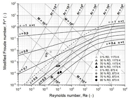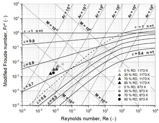 In Table A1 and Table A2, the dimensionless numbers for each reduction degree at 873 and 1173 K, respectively, are presented, and then calculated and drawn into an extended version of the fluidized state diagram according to Reh in Figure 6 [48]. The characteristic particle diameter and sphericity were assumed to remain the same over the whole reduction progress. The gas densities and dynamic gas viscosities were calculated using the process conditions from Table 2. The particle densities at the defined degrees of reduction were calculated assuming that the initial true density was 5000 kg/m3, consisting of hematite or oxidized magnetite with 5 wt.−% gangue material. In addition, according to Ergun, the minimum fluidization velocities were calculated using a void fraction at the point of minimum fluidization of 0.65 [60].