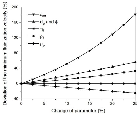 The effects of the parameter on the minimum fluidization velocity were given by sensitivity analysis using Equation (10). The initial values for the calculations were taken from the mathematical case at 873 K and 0% RD. The data for the analysis are listed in Table A5 and illustrated in Figure 8 as a deviation from the initial data. It can be seen that the sphericity, the characteristic diameter, and especially the void fraction at had a significant influence on the minimum fluidization velocity, according to Ergun. In addition, the sphericity and the characteristic diameter affected the minimum fluidization velocity the same way, as indicated by the overlapping curves in Figure 8. A change of 25% in the sphericity and the void fraction at was the upper limit of the possible deviation. In contrast, an increase in the particle diameter of 25% was, in view of agglomeration phenomena, at the lower limit; increasing the particle diameter from 25 to 250 and 500 µm resulted in increases in the particle diameter of 900% and 1900% and, hence, deviations in of approximately 10,000% and 40,000%, respectively. This relation explains the strong increase in the minimum fluidization velocity from the first to the second case study for 70% and 95% RD.