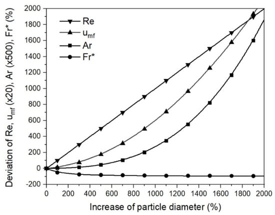 Focusing on the primary influencer of the fluid dynamics, the particle diameter, Figure 9 shows the deviations in Ar, Re, Fr*, and as a function of the change in the particle diameter. The scale of the Y axis for Ar and was adapted for the factors 500 and 20, respectively. The initial parameter used for the calculation remained similar. The slip velocity for Re and Fr* calculation was set at 0.321 m/s, assuming a superficial gas velocity of 0.25 m/s and a void fraction of 0.78 in the fluidized state, similar to the mathematical case studies. As given in Equations (2) and (3), the Reynolds number was directly proportional to the particle diameter and the Archimedes number by the power of three. This correlation meant an increase from 25 to 250 and 500 µm, and resulted in Reynolds numbers that were 10 and 20 times higher, but Archimedes numbers that were 1000 and 8000 times higher. As a result, the modified Froude number decreased, and the drag coefficient increased similarly to the Reynolds number, as given in Equation (7). Identical to the Archimedes number, the minimum fluidization velocity, according to Ergun, increased by more than a directly proportional amount. This correlation appeared differently in the sensitivity analysis of in Figure 8, because only a minor increase in the particle diameter is shown, meaning that a larger increase in the particle diameter is represented and, thus, a larger deviation of .