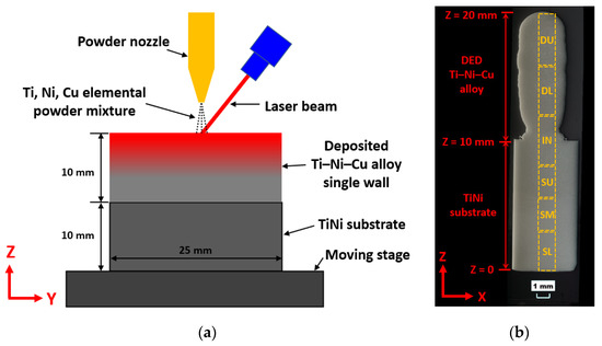 (a) The schematic of joining bi-metallic SMA using DED in this work. (b) Image of the XZ-plane cross-section of the bi-metallic structure including the TiNi substrate and the DED Ti–Ni–Cu alloy. The bottom line of the substrate has been marked as Z = 0. The Z height of the interface and the top point are 10 mm and 20 mm, respectively.