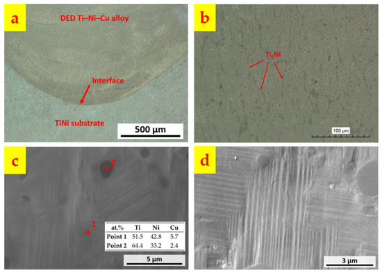 Microstructural features of the as-deposited Ti–Ni–Cu SMA. (a) Interfacial region between the DED Ti–Ni–Cu SMA and the TiNi substrate. (b) Microstructure of TiNi matrix and Ti2Ni. (c) EDS point analysis of TiNi matrix and Ti2Ni. (d) Twinning structure of martensitic TiNi phase.