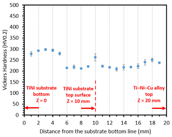 Vickers hardness distribution from Z = 1 mm to Z = 19 mm with a 1 mm interval is plotted in Figure 5. Figure 5 shows the average hardness of the three indentations at each Z height. It can be seen that the Vickers hardness distribution from bottom to top shows typical low hardness (200~300 HV0.2) of the entire cross-sectional area along the Z direction of the bi-metallic structure. It was reported in [31] that the hardness of the intermetallic Ti2Ni phase could be as high as 700 HV. Thus, the low hardness reflects that the major phase of this bi-metallic structure is the TiNi phase, and the Ti2Ni intermetallic phase is the dispersive secondary phase in the as-deposited Ti–Ni–Cu alloy section due to the rich atomic composition of the Ti element. Almost all of the average hardness values of the DED Ti–Ni–Cu alloy (above Z = 10 mm) are within the range of 200~250 HV0.2. Within the substrate, from Z = 1 mm to Z = 9 mm, an obvious difference in the average hardness value can be observed between the lower half of the substrate and the upper half of the substrate. The average hardness values of the lower half of the substrate (Z < 6 mm) are closer to 300 HV0.2. The hardness also obtains a higher value at the location of Z = 10 mm, which could be due to the local mixing of the Ti, Ni, and Cu elements between the TiNi substrate and the first layer of DED Ti–Ni–Cu alloy that might result in a local small composition deviation in the TiNi matrix compared to the original TiNi substrate.