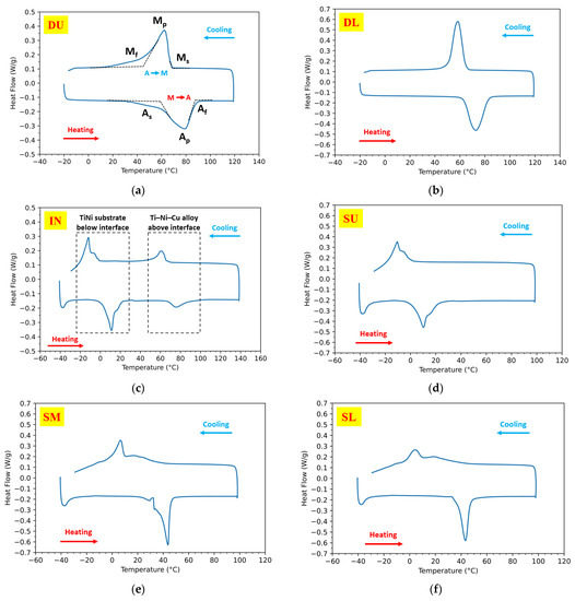 DSC results in all six different sections: DU, DL, IN, SU, SM, and SL, according to Figure 1b, are demonstrated in Figure 6 from Figure 6a–f, respectively. Each DSC curve consists of a heating and cooling cycle with peaks that indicate the austenite formation during heating and the martensite formation during cooling. Typical characterization temperatures, including martensite starting temperature (Ms), martensite finishing temperature (Mf), austenite starting temperature (As), and austenite finishing temperature (Af), are determined by the tangent method [32] as shown in the DSC curve of sample DU in Figure 6a. Austenite peak temperature (Ap) and martensite peak temperature (Mp) are also included.