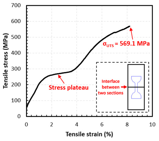 The stress–strain curve of the DED as-deposited bi-metallic structure. The miniature tensile sample was extracted with the interfacial line located at the center of the gauge section.