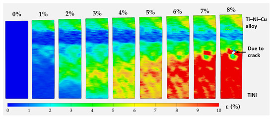 The strain map of the local axial strain within the gauge section at the moments when the total tensile strain equals 0, 1%, 2%, 3%, 4%, 5%, 6%, 7%, and 8%.
