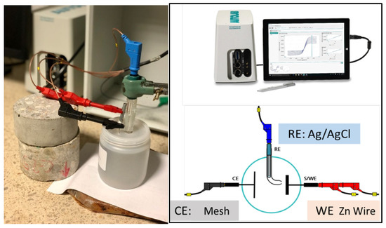 Galvanizing protects steel through two mechanisms. Firstly, it creates a physical barrier that isolates it and acts as a sacrificial anode. In addition, corrosion products create a second protective barrier. The behavior of zinc in alkaline media has already been considered in the literature [1,2,3]. Zinc in contact with the alkaline matrix of cement in its fresh state shows temporary chemical instability. High pH values of the aqueous phase inside concrete pores, usually above 12.5, cause zinc oxidation. The cathodic reaction is associated with water hydrolysis and generates hydrogen on the galvanized surface, according to Equation (1).