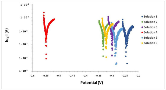 Figure 2 shows polarization resistance curves resulting from LPR measurements at the end of the test. Curves show the cathodic and anodic branches and corrosion potential. All zinc wires showed their potentials with an intermediate corrosion probability (Ecorr > −332 mV) except for Solution 4, which produced somewhat higher values.