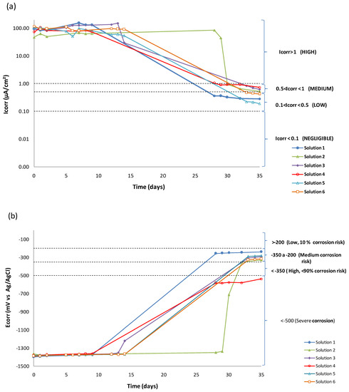 Starting point results were very electronegative for all solutions (–1.4 V) and showed corrosion current densities around 100 µA/cm2. After 35 days of testing, the potential increased to less electronegative values, higher than −0.3 V (except for Solution 4). Corrosion current density decreased to 0.5 µA/cm2. These values of Ecorr were also recorded in other works. In particular, at a pH value of 13, Zn is actively dissolved, giving rise to a soluble phase of Zn(OH)42− in the potential range between −1.35 to −1.45 VSCE [29]. The corrosion current density decreases until they reach values between 0.1 and 1 µA/cm2.