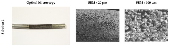 Only one isolated white crystal of calcium hydroxyzincate Ca(Zn(OH)3)2 was found on the surface of the wire exposed to Solution 2. Due to the high pH of the solution, the crystal becomes larger and does not have the capacity to homogeneously coat the surface of the wire (Figure 9) [14]. By observing the SEM appearance of this crystal, it was possible to identify a totally different morphology from those observed on the surface of the other wires. Small crystallized threads can be observed.