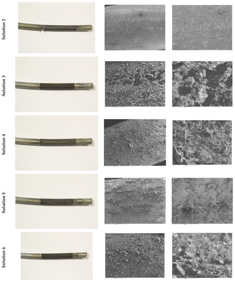 Figure 8 shows images of different steel surfaces obtained by optical microscopy and SEM after electrochemical analysis in synthetic solutions. No traces of iron oxides are observed on the surface of the wires. The Solution 1 wire is homogeneously coated with prismatic crystals, possibly of Zn4(SO4)(OH)6 · 3H2O. The Solution 3 wire shows a distributed oxide layer, leaving large voids on the surface. The size and coating of the crystals in the rest of the wires varies. This can be attributed to insoluble crystalline products such as Zn5(CO3)2(OH)6, ZnCO3, Zn5Cl2(OH)8 · H2O, ZnO, or others with the ability to passivate galvanized steel to a greater or lesser extent [15]. Some areas of exposure are darker in color due to increased detachment of the zinc layer and oxidation of the steel.