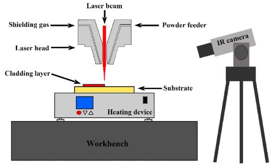Quality defects, such as unmelted powder, micro-cracks, and pores, can be easily caused by physical property differences between materials, the unreasonable selection of process parameters, etc., in the LC process [12,13]. To enhance the forming quality of the cladding layer, domestic and overseas scholars reported the relationship between the coating’s forming quality and LC process parameters [14,15] in the preparation process of composite coatings. Some researchers also reinforced the comprehensive performance of coatings using such methods as changing the laser cladding spot [16,17,18] and changing the processing path [19]. Although there are many ways to reduce coatings defects, the results are not very effective. For the past few years, with further study into the LC process, researchers have found that the combination of the assisting laser processing process with laser cladding can well enhance the forming quality of the composite coating. Qi et al. [20] used the magnetic-field-assisted LC to create a TiB2/metal composite material on a titanium alloy’s substrate. They believed that the magnetic field could have a mixing effect on the molten pool, thus refining the TiB2/metal composite coatings. The TiB2 grain size decreases as the magnetic field intensity increases, and the coating defects reduce. The assisting laser processing process can also improve the wear and corrosion resistance properties of the coating. Wen et al. [21] successfully prepared a crack-free FeCrCoAlMn0.5Mo0.1 coating using ultrasound-assisted LC technology. The research results showed that both wear and corrosion resistance properties of the coating are better than those of the substrate. Liu et al. [22] prepared a Ni60CuMoW coating on the surface of medium carbon steel 45 using a mechanical-vibration-assisted LC composite surface modification process. They believed that mechanical vibration can apparently strengthen the corrosion and wear properties of the cladding layer. According to Reference [23], its authors conducted research on a nickel-based WC composite material by introducing an assisting process—preheating. This research showed that preheating the substrate with a heater can reduce the temperature gradient (G), the solidification rate (R), and the cracking susceptibility of the cladding layer. Farahmand et al. [24] confirmed that the defects of the cladding layer are reduced with the assistance of preheating. Bidron et al. [25] attempted to reduce crack defects in the cladding layer by using induction preheating for a CM-247LC high-temperature alloy, and the results of the study showed that a cladding layer without crack defects could be obtained when the substrate preheating temperature was 1050 °C. To further verify the effects of various parameters in the substrate preheating-assisted process on the crack density of the cladding layer, Soffel et al. [26] used direct metal deposition to prepare nickel-based coatings on the surface of stainless steel and investigated the effects of substrate temperature, specimen geometry, deposition parameters, and scanning strategy on the crack density, and the results showed that increasing the substrate temperature and reducing the specimen size by laser preheating could obtain a crack-free deposited structure. Liu et al. [27] used a combination of numerical simulations and experiments to verify that the cooling rate decreases with increasing heat flow density of the preheating heat source, and the temperature gradient decreases rapidly with increasing distance from the surface