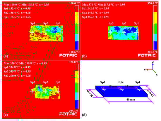 Temperature contour diagrams when the substrate was preheated to a predetermined temperature: (a) 150 °C; (b) 250 °C; (c) 350 °C; (d) temperature monitoring points.