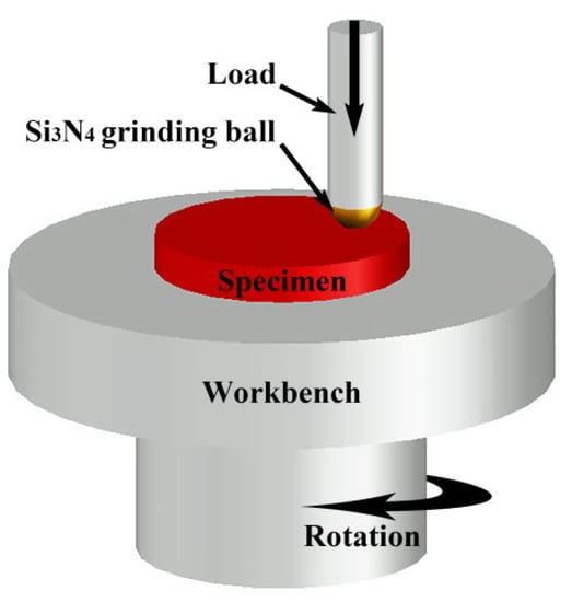 For mechanical properties, the microhardness of the metal-based Stellite 6/WC coating was measured along the cladding depth (radial direction) with a Vickers microhardness tester (model: WILSON VH1202, manufacturer: BUEHLER, Lake Bluff, IL, USA) under the conditions of 100 g load and 10 s loading time. A wear resistance property test was performed on the cladding specimens with a friction wear tester (model: CFT-I, manufacturer: Lanzhou Zhongke Kaihua Technology Co., Ltd., Lanzhou, China) at room temperature. Figure 4 shows a schematic representation of the wear test. The friction wear test was conducted under dry sliding conditions. The grinding material was a φ4 mm silicon nitride ceramic (Si3N4) ball. The mode of motion was rotary motion. The applied load was 40 N. The rotational speed was 200 revolution per minute (RPM). The rotation radius was 0.8 mm. The frequency was 1 Hz. The test time for each specimen was 30 min. A high-precision analytical balance (model: FA2104N, accuracy: 0.1 mg, manufacturer: Shanghai Precision Scientific Instrument Co., Ltd., Shanghai, China) was used to weigh the specimens before and after the test. To calculate the mass loss, each specimen was weighed five times (averaged). The mass loss was converted into a volume loss by being divided by the corresponding density value. The weighted density method was used to transform the mass loss in the composite material’s cladding layer into a volume loss [32]. Microstructure analysis of the worn specimens was performed with an SEM. It should be noted that the microstructural characteristics, microhardness, and wear resistance tests of the cladding layers in this study were all conducted at the same cross-section.
