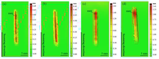 Figure 5 shows the 3D scanning morphology of the cladding layer when the substrate is heated to different temperatures. It can be seen that the morphology of each specimen is significantly different from that of others. As shown in Figure 5a,b, when the substrate is not preheated and when it is preheated to 150 °C, the height of the metal-based composite coating basically remains consistent, but the surface height differences are significantly different. Substrate preheating contributes to a reduction in the surface height difference of the coating because substrate preheating increases the duration of the molten pool, and the cladding layer in the molten state tends to level out under the combined action of coating surface tension and gravity. Figure 5c,d show the surface morphologies of the composite coating when the substrate is heated to 250 °C and 350 °C, respectively. The height of the Stellite 6/WC cladding layer is found to increase, as the substrate preheating temperature rises. The reasons for this phenomenon are summarized as follows: (1) In the event that other factors are unchanged, the increase in the preheating temperature in the LC process causes an increase in thermal output received by the substrate and the cladding powder, and thus an increase in molten powder volume. The molten substance diffuses on the substrate under gravity to form a high cladding layer. (2) It may be related to the characteristic of slow heat release when heat is accumulated in the WC powder, causing more heat accumulation in the coatings and an increase in the composite coating height. In addition, applying an excessive preheating temperature to the substrate may cause an increase in the surface height difference of the coating because heat accumulation appears in the coating in the LC process, and the heat at the endpoint of cladding is higher than that at the start point so that the maximum cladding height appears at the endpoint, forming a large height difference.