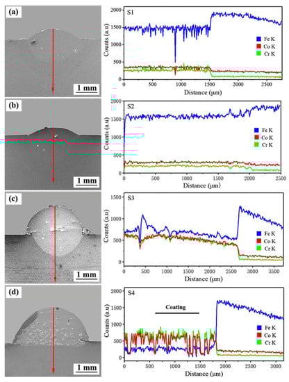 Line EDX between the Stellite 6/WC composite coating and the substrate of different specimens: (a) S1; (b) S2; (c) S3; (d) S4.