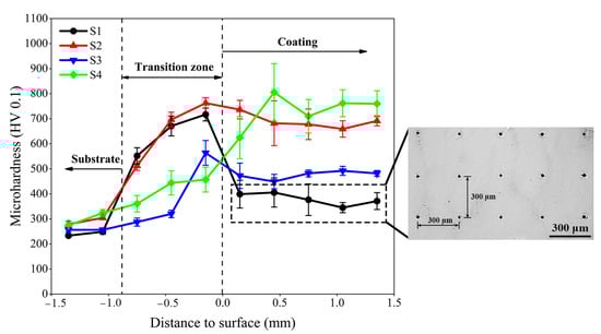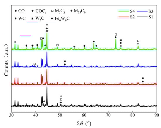 The microhardness distribution results of different specimens along the cross-sectional depth are given in Figure 10. As indicated in the graph, the average microhardness values of the Stellite 6/WC composite coating of several specimens are in the following order from high to low: S4 (732.38 HV0.1) > S2 (689.37 HV0.1) > S3 (475.51 HV0.1) > S1 (379.50 HV0.1). Based on the results of Farahmand et al. [24], they concluded that if the coating received too much heat input it would lead to WC dissolution and lower coating hardness. When the substrate is preheated at 150 °C and 250 °C, the hardness of the clad layer is consistent with the above findings. However, the hardness of the cladding layer of the S4 specimen is the highest when the substrate was preheated at 350 °C, about 2.45 times that of the substrate 60Si2Mn. Analysis of the XRD test results of the cladding layer of different specimens in Figure 11 shows that more carbide M7C3 and WC hard phases are formed in the cladding layer of the S4 specimen than in other specimens. In addition, the dilution rate of the S4 cladding layer is lower. Therefore, the microhardness of the S2 clad layer is between S3 and S4. It has been also reported in Reference [37] that the lower dilution rate resulted in higher microhardness of the composite coating. For some specimens (S1, S2, and S3), the microhardness in the cladding layer zone is smaller than that in the transition zone. This is mainly caused by the settling process after the crystallization of large WC particles.