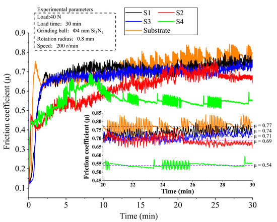 Friction coefficient curves of the substrate and the Stellite 6/WC composite coatings of different specimens.