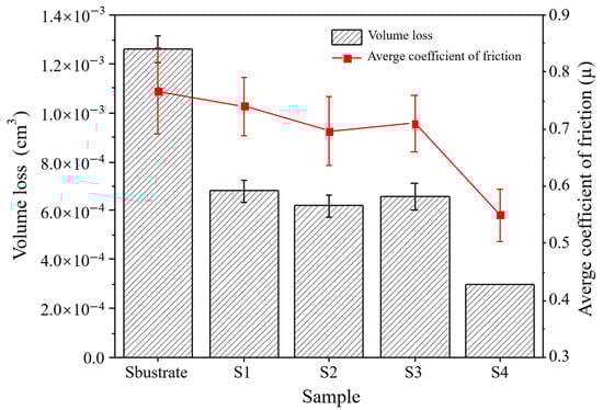 One of the most significant property characterization methods for composite coatings is wear property. As a result, the friction coefficient, wear volume, and wear profile were used to assess each specimen’s wear property. In order to objectively reflect each specimen’s wear property, each specimen was tested under identical test settings. Figure 12 shows the friction coefficient vs. time graphs after dry friction wear of the 60Si2Mn substrate and the Stellite 6/WC cladding layer of different specimens. The results show that the friction coefficients of all specimens increase quickly and have a large fluctuation range at the initial stage of the friction test. Because this stage is the running-in stage of the friction wear process, and the contact between the friction pair and the tested specimen surface is unstable, the friction coefficient increases and has a large fluctuation range. The contact between both of them tends to remain steady as the wear duration increases and the above-mentioned phenomenon is mitigated. In this paper, the friction coefficients of each specimen at 20–30 min were selected as reference values and an average friction coefficient was calculated. The average friction coefficients and wear volumes of different specimens are in the following order from high to low: Substrate > S1 specimen > S3 specimen > S2 specimen > S4 specimen; see Figure 12 and Figure 13. Contrary to the microhardness trend, the average friction coefficient and wear volume of the coating are gradually reduced, which follows the Archard equation [38]. When the substrate is heated to 350 °C, the average friction coefficient and wear volume of the coating reach minimum values and are 0.54 and 3 × 10−4 cm3, respectively. This indicates that the wear property of the S4 specimen is excellent. The reason for this phenomenon is that it is mainly attributed to the formation of hard phases such as WC, M7C3, and M23C6 in the S4 cladding layer, which enhances the hardness of the coating. Therefore, the above phenomenon occurred. In addition, a comparison of the average friction coefficient and wear volume among the substrate, the S1 specimen, and the S4 specimen shows that (1) the average friction coefficient of the S1 specimen is 1.37 times that of S4, and the wear volume of the S4 specimens is 0.44 times that of S1; (2) the average friction coefficient of the S4 specimens is 0.70 times that of the substrate, and the wear volume of the S4 specimens is 0.24 times that of the substrate. To sum up, the temperature at which the substrate is preheated has a significant influence on the composite coating’s wear properties.