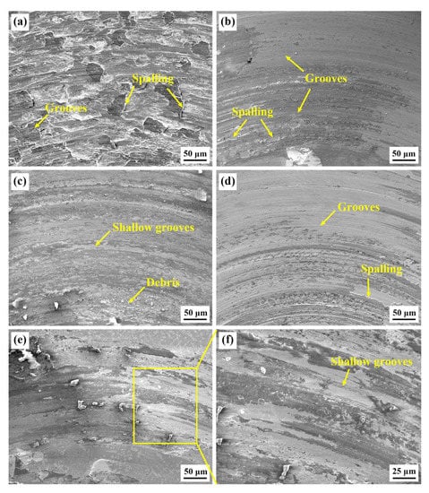 SEM wear morphologies of the Stellite 6/WC composite coatings of different specimens: (a) substrate; (b) S1; (c) S2; (d) S3; (e) S4; (f) magnification of the yellow rectangular area.