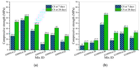 In Figure 3b, the flexural strength of G10PP0-0.27, G10PP0-0.30 and G10PP0-0.40 has a similar change trend to the compressive strength. G10PP0-0.40 has the largest flexural strength, and the 28-day flexural strength is 5.7 MPa. In the samples of G10PP0-0.55, G10PP0-0.58 and G10PP0-0.62, compared with the compressive strength, the flexural strength of G10PP0-0.62 was not decreased, but it significantly increased and reached 6.01 MPa at 28 days, which was the maximum strength in group 2.