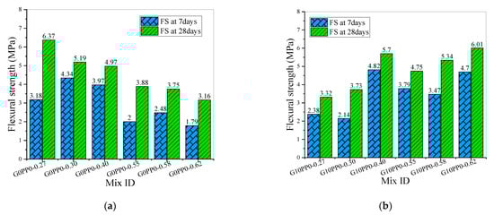 Figure 3 shows the flexural strength test results of the HFRM with high volume mineral admixture. It can be seen that in Figure 3a, without adding fibers, the 7-day flexural strength of mortar samples has exactly the same change trend as the corresponding 7-day compressive strength in Figure 2a. However, the 7-day flexural strength of G0PP0-0.30 is only 36.48% higher than that of G0PP0-0.27, and the 7-day compressive strength of G0PP0-0.30 is 114.73% higher than that of G0PP0-0.27, while the 28-day flexural strength and compressive strength of G0PP0-0.27 increased by nearly 100% compared with the 7-day strength value. Therefore, in the samples without fiber, the flexural strength of GOPPO-0.27 is optimal, which reached 6.37 MPa.