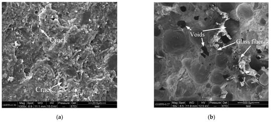 Figure 6 shows the scanning electron microscope (SEM) images of some representative mortar samples. Figure 6a shows the microstructure of G0PP0-0.30. It can be seen that when the fiber incorporation amount is 0, cracks occur on the gel surface due to hardening and shrinkage. As shown in Figure 6b, although no cracks were generated after 2% GF was added, the low water/binder ratio (w/b = 0.27) and fiber incorporation resulted in the poor working performance of fresh mortar and difficulty in molding, resulting in a large number of pores in mortar. In Figure 6c,d, it can be seen that the fibers are evenly distributed and the mortar structure is dense. In Figure 6d, GF and PPF form a three-dimensional staggered support network, and the cracks in the cementitious matrix can only continue to develop by bypassing the fiber, breaking the fiber, or pulling the fiber out, thus limiting the expansion of the crack tips in the cementitious matrix [33,57,63]. This is one of the important reasons for the improved strength and wear resistance of this mortar sample.