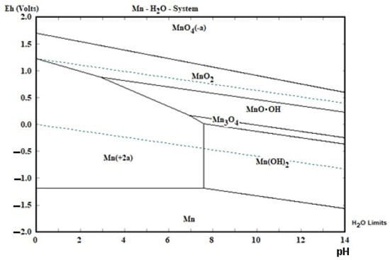 The potential—pH diagram for Mn-H2O system at 25 °C and 1 bar for molality 1 mol∙kg−1 H2O [33].