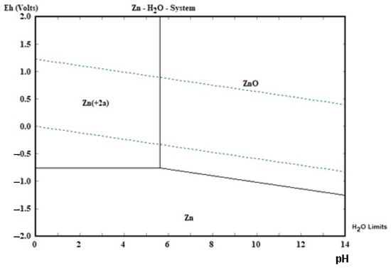 The potential—pH diagram for Zn-H2O system at 25 °C and 1 bar for molality 1 mol∙kg−1 H2O [33].