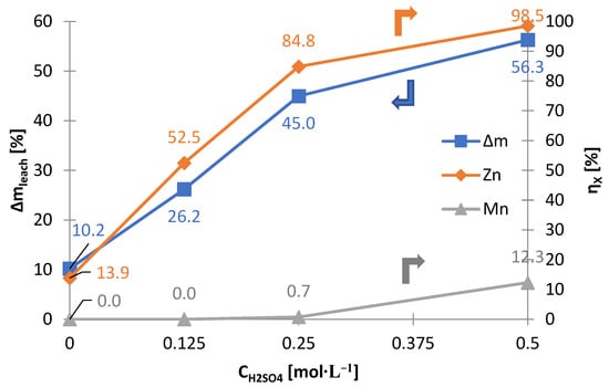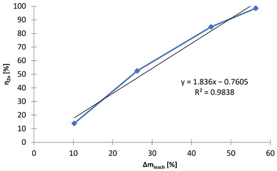 Figure 5 shows the relationship between the mass change of the solid phase (∆mleach) and the leaching yields (ηX) of zinc and manganese, depending on the concentration of sulfuric acid. As a result of leaching, 10–60% of the solid phase was leached, depending on the concentration of sulfuric acid: 0–0.5 mol∙L−1. Leaching with dilute sulfuric acid (0–0.25 mol∙L−1) causes the majority of zinc, up to approx. 90%, to dissolve while maintaining a minimum manganese dissolution, not more than 1%. Increasing the concentration of sulfuric acid partially dissolves the manganese, therefore selectivity is no longer maintained. Thanks to the appropriate conditions, no iron leaching was registered in any case (concentration of iron in the solution was below the level of determination). Between ∆mleach and ηZn in the range of CH2SO4 = 0–0.5 mol∙L−1, there is a close linear relationship, R2 = 0.9838 (Figure 6). Hence, manganese leaching only contributed to a minor extent to ∆mleach.