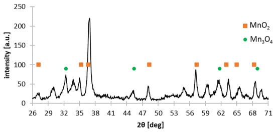 Table 3 shows the chemical composition of the solid residues after leaching without reducing agent. As the concentration of sulfuric acid increases, the concentration of manganese and iron increases, to approx. 91 and approx. 3 wt.%, respectively, and the concentration of zinc in the solid residues decreases, to approx. 1.5 wt.%, which confirms the effectiveness of the selective leaching. The material consists mainly of manganese oxides of various oxidation states (Figure 7). MnO2 is slightly soluble in sulfuric acid, and Mn2O3 does not dissolve. In water (0 mol∙L−1), potassium, chlorine and ammonium salts can be dissolved from black mass. The solution after leaching with water was strongly red, confirming the above claim. With regards to potassium, a decrease in the content of this element in the solid phase was noted, from approx. 6.5 to 1% by mass (compare Table 2 and Table 3).