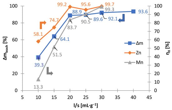As an alternative to selective leaching, non-selective leaching tests were carried out with the use of the manganese reducing agent, i.e., ascorbic acid. During the leaching, gas bubbles intensely evolved, which indicated that the ascorbic acid was oxidizing (CO2 evolution). The ratio of liquid to solid phase (l/s) was adopted as the critical technological parameter, which reflected the scale and profitability of recycling alkaline batteries by the hydrometallurgical method. Figure 8 shows the effect of the solid phase mass loss and the zinc and manganese yields, depending on the liquid-solid ratio. The following conclusions can be drawn from Figure 8: mass loss is very high, to almost 100%; the optimal liquid-solid ratio value is 20 mL∙g−1, above this value of liquid–solid ratio, the manganese and zinc leaching yields are equally high; it is possible to leach manganese and zinc to almost 100% by reductive leaching; iron does not dissolve. The high value of liquid–solid ratio, equaling 20 mL∙g−1, raises doubts about the use of this method in industrial practice. Another inconvenience is the emission of CO2 (see Equation (4)), a greenhouse gas. The European Union is trying to reduce emissions of greenhouse gases [41]. The advantage of this method of leaching is bringing the manganese and zinc into the liquid phase, which facilitates their further processing.