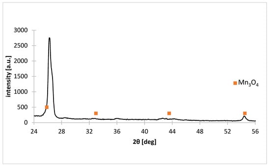 Table 4 shows the composition of the solid residues after reductive leaching for different liquid–solid ratio ratios. As the liquid–solid ratio increases, the concentrations of manganese and zinc in solids decrease, to approx. 4 and 1.5 wt.%, respectively, and the concentrations of iron, barium and sulfur increase; the exception is liquid–solid ratio = 40 g∙L−1, for which the zinc and manganese contents increase to approx. 12 and 11% by mass, respectively, compared to liquid–solid ratio = 30 g∙L−1. Iron does not dissolve and its content in solid residue is from about 1 to about 33% by mass; the sulfur content is likely to be due to the precipitated sulphate salts; the presence of barium can be explained as the presence of scrap electrical elements containing perovskites (barium compounds) [42]—the barium content reaches up to about 40% by mass. The manganese contained in the residue is primarily insoluble Mn3O4 (Figure 9), which cannot be leached under these technological conditions. Please note that the residue also includes graphite which, due to the composition determination method, cannot be determined.
