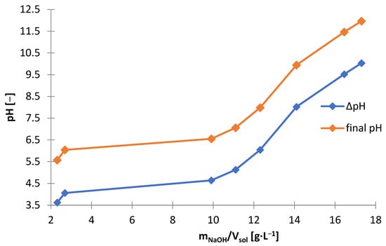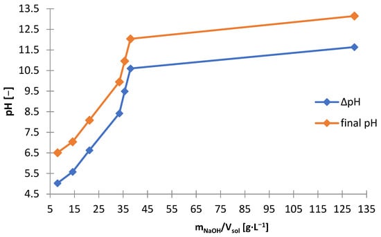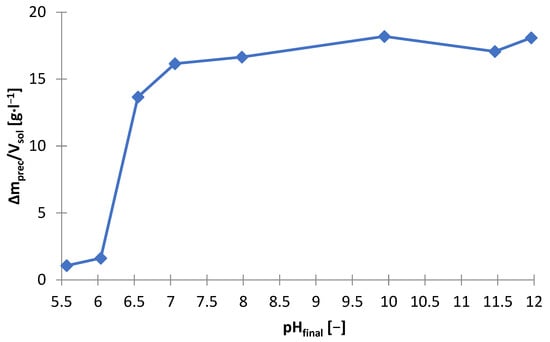 The effect of sodium hydroxide as a precipitating agent from the solution after selective (Figure 1) leaching is presented in Table 5, which shows the amounts of NaOH needed to make the solution alkaline to the adjusted pH (mNaOH/Vsol), and includes the amount of solid phase precipitated (∆mprec/Vsol)) Yhe graphs below are presented on its basis: Figure 10 and Figure 11. Figure 12 shows the precipitation yields of zinc and manganese. Up to pH = 5.5 and 6, there was little precipitate, i.e., 1.0–1.6 g∙L−1, but at pH = 6.5, the amount of the precipitate was 13.6 g∙L−1 (Figure 10). Further alkalization did not, practically, contribute to any further gain in amount. The substantial amount of NaOH needed to reach pH = 6.5 indicates a precipitation process (Figure 11). Figure 12 shows that at pH = 6.5, more than 90% of zinc and a little manganese (approx. 2%) precipitated. The increase in pH led to a slight increase in zinc precipitation yield, i.e., to a value of approx. 95%, and to an increase in manganese precipitation yield, i.e., 8–47%. Thus, the best pH value to strive for is 6.5 as it allows most of the zinc to precipitate, while maintaining a low manganese precipitation yield.
