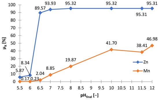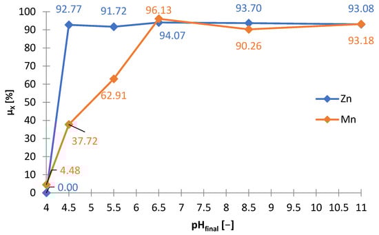 Effect of final pH (pHfinal) on precipitation yields (μX) of zinc and manganese during precipitation by using Na2CO3 from solution after selective leaching.