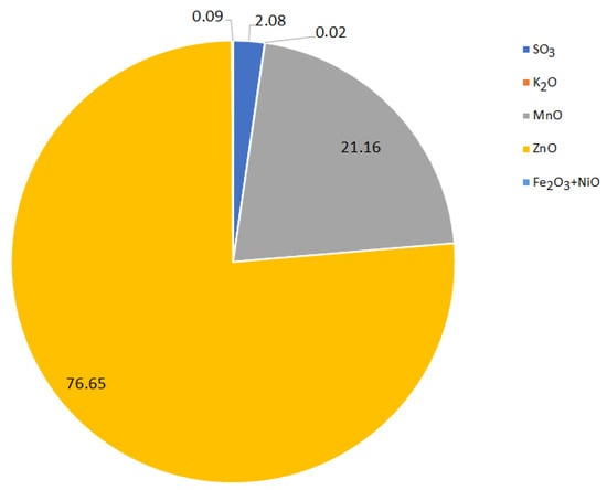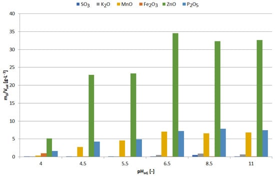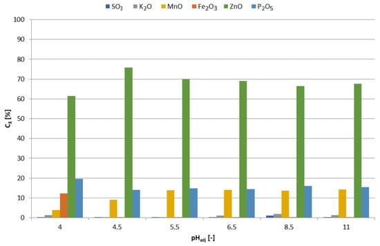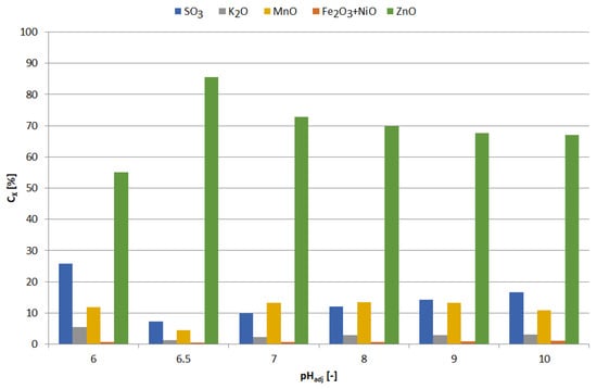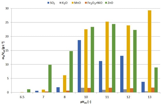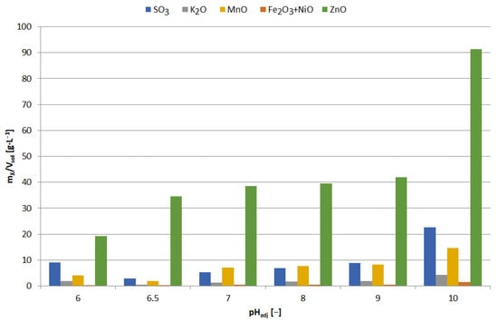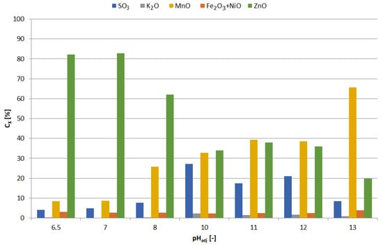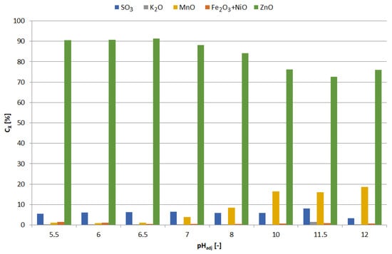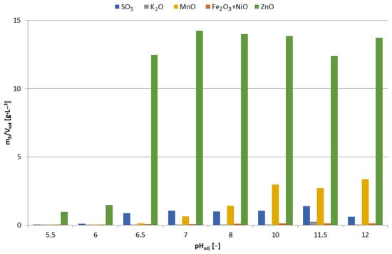 The precipitates were yellowish white when obtained at pH = 5.5–6, and white at pH = 6.5; blackening of precipitates due to air was observed with increasing pH. Figure 13 shows the chemical composition of the precipitates and Figure 14 the relationship between adjusted pH and the amounts of precipitated elements (mX/Vsol, g∙L−1). The precipitates obtained at pH = 5.5–6.5 had a high concentration of zinc and a low concentration of manganese, i.e., 90–91 and 1.0–1.1 wt.%, respectively. An increase in pH caused an increase in manganese content at the expense of zinc, 4–18 and 88–76 wt.%, respectively. In the range of pH = 5.5–10, the concentration of SO3, resulting from the co-precipitation of sodium sulphate, was constant and amounted to 5.5–6.5 wt.%; at pH = 11.5 it amounted to approx. 8 wt.%.
