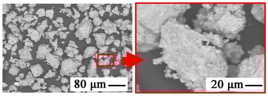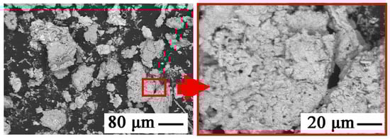 Figure 15 shows the precipitates obtained at pH = 6.5 with a high concentration of zinc and a low concentration of manganese, i.e., 91 and 2 wt.%, respectively. The enlarged area (Figure 15) indicates the propagation of zinc concentrate in the areas of NaOH lumps. The remaining gray-black-black areas are fragments of Zn-Mn solution with NaOH mixture—a kind of eutectic mixture.