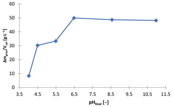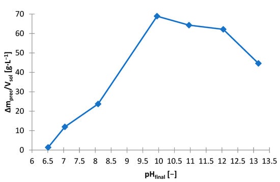 Effect of final pH (pHfinal) on amount of precipitate (∆mprec/Vsol) during precipitation by using NaOH from solution after selective leaching.