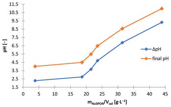 Another precipitating agent that has been investigated for use in selective precipitation of zinc from selective treatment (Figure 1) was sodium carbonate (Na2CO3). Table 8 shows the amounts of Na2CO3 needed to make the solution alkaline to the adjusted pH (mNa2CO3/Vsol) and includes the amount of solid phase precipitated (∆mprec/Vsol)), and the graphs below are presented on its basis: Figure 27 and Figure 28. Figure 29 shows the precipitation yields of zinc and manganese. During the addition of Na2CO3 to the solution, gas bubbles escaped from the solution and a characteristic hissing could be noticed: both resulted from the decomposition of carbonate in the acidic environment towards the release of CO2. The precipitated solid phases were very fine, which made their filtration from the solution very difficult and almost impossible with the use of even a fine precipitate filter and slow filtration. By analyzing Figure 27, Figure 28 and Figure 29, we can distinguish three stages of alkalization: