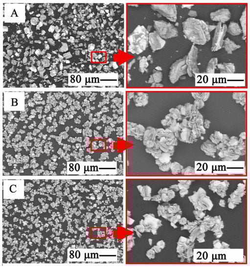 SEM image of the phases precipitated during selective alkalization and zinc precipitation with Na3PO4 for: (A): pH = 4.0, (B): pH = 4.5, (C): pH = 6.5.