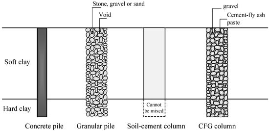The current study introduces cement fly ash gravel (CFG) mixtures created by mixing cement, fly ash, and gravel as a column to support embankments built on soft clay instead of the concrete pile, granular pile, or soil-cement column. The cement was partially replaced with fly ash to save the cement cost and relieve environmental problems related to using cement alone [26]. Thus, the raw materials used for the CFG mixture utilizes are different from pervious concrete and controlled low strength material. Moreover, using the CFG mixture in civil engineering works differs from pervious concrete and controlled low strength material, as earlier mentioned. The CFG column exhibits high bonding and can be embedded in the stiff to hard clay layer (Figure 2), employing a similar construction method to a granular pile. The strength of the CFG column is sufficiently high to resist high embankment stress, and the material cost of the CFG column is safer than porous concrete and regular concrete.