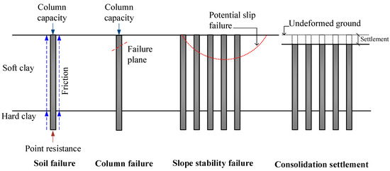 Since soft clay has a low shear strength, high compressibility, and low permeability, the construction of highway and railway embankments on the soft clay layer results in slope instability, low bearing capacity, and significant settlement problems. Such problems can create construction delays and additional rebuilding costs [1]. Moreover, consolidation settlement caused by dissipating excess pore water pressure takes a long period because of the low permeability of the soft clay. Therefore, a soil improvement technique, a column-supported embankment, has been commonly introduced to maintain slope stability, increase the bearing capacity, and reduce settlement [2], as shown in Figure 1. The columns used for supporting embankments built on soft clay foundations include concrete piles, granular columns (stone columns or sand compaction piles), and soil-cement columns (Figure 2). Concrete piles have high strength and can be driven through the stiff to hard clay layers to obtain high pile capacity and reduce embankment settlement. Granular piles are built by driving a steel casing to the hard clay layer from the ground surface. The clays contained in the case are removed and replaced with stones, gravels, or sands to enhance the bearing capacity of the soft clay [2]. The granular pile can accelerate the consolidation process induced in the soft clay since it acts as a vertical drain because of the high permeability of sand or stone used. The excess pore water pressure generated by the traffic and embankment loads can be rapidly dissipated through vastly interconnected pores between particles of sand and stone [2]. However, the primary disadvantage of granular piles is that the aggregates used to create the columns are cohesionless materials without internal bonds. The granular pile’s typical cohesion and friction angle values ranged from 1 to 10 kPa and 30 to 40°, respectively [2,3,4]. The perpendicular stress from the embankments is required to produce shear strength. Therefore, the granular piles are ineffective under low vertical stress situations, including those located at the embankment toe and granular piles used for lateral support work in soft clay.
