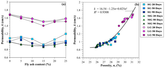 Relationships between (a) permeability coefficient and fly ash content and (b) permeability coefficient porosity.