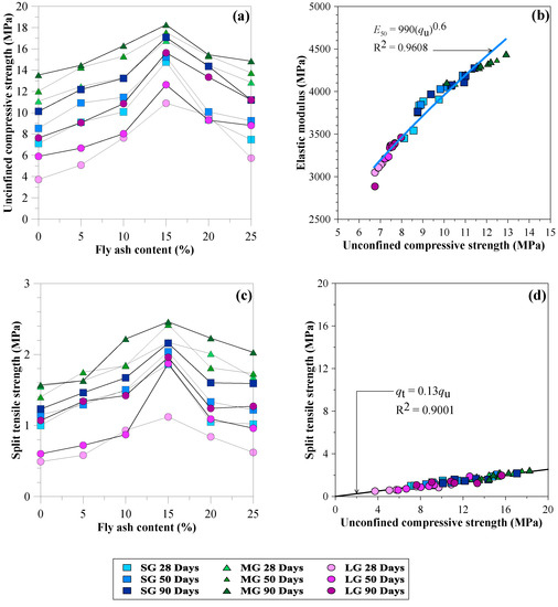 Relationships of (a) unconfined compressive strength versus fly ash content, (b) relationship of elastic modulus and unconfined compressive strength, (c) splitting tensile strength versus fly ash content, (d) relationship of splitting tensile strength and unconfined compressive strength.