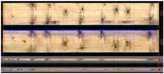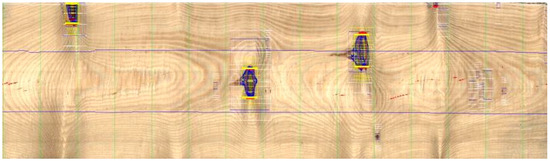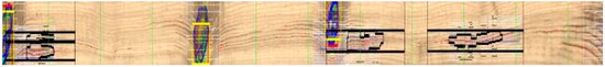 The present study assessed defects in the anatomical structure and secondary defects (cracks) in the obtained sawn timber. Visual examination of the sawn timber was carried out with the use of a four-sided optical scanner Q-Scan 604, produced by the Polish company Woodinspector form Lublin, Poland. The experimental material was tested by measuring defects, such as knots and disruptions of grains for individual planes, and automatically digitizing and mapping in terms of the frequency of defects present in the examined surface (Figure 1, Figure 2 and Figure 3). Most of the processes in automated timber sorting are related to defect recognition. For crucial defects, proper designations were adopted for knots: