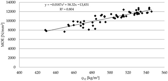 In the conducted research, the relation between the modulus of elasticity and the density of sawn timber with a moisture content of 12% (ρ12) was determined. The obtained results show a correlation at a level of R2 = 0.804, which can also be described by the following function: MOE = −0.0187ρ2 + 58.32 ρ − 138,831 (Figure 4). Thus, the analyzed values indicate a high level of fit between the MOE and the density of the tested pine timber. Moreover, the Spearman’s rank correlation coefficient was R = 0.896 at a significance level of p < 0.001, which shows a high level of correlation between the results of the determined properties.