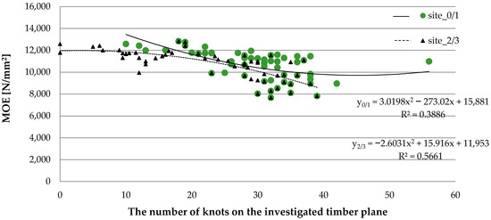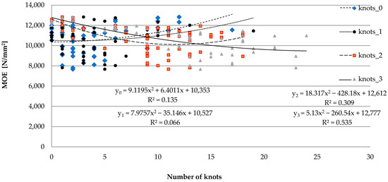 The results confirm the observations previously described by Lin et al. [29], Lukacevic et al. [56], and Wright et al. [57] regarding the effect of knot presence on MOE values. In the case of analyzing the effect of the quantity of knots occurring on the wide planes, the Spearman’s rank coefficient was R = −0.67 at a significance level of p < 0.001, which can be described by the function y0/1 = 3.0198x2 − 273.02x + 15,881. At the same time, the Spearman’s rank coefficient was R = −0.30 when analyzing the effect of knot occurrence within the narrow planes on the MOE results, and it can be described as follows: y2/3 = −2.6031x2 + 15.916x +11,953.