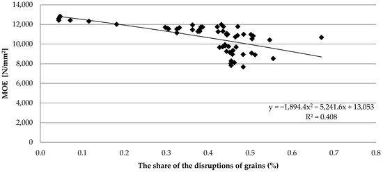 The occurrence of knots is associated with a change in the anatomical structure of wood. The resulting disruptions of grains may cause a deterioration in the strength parameters, e.g., represented by MOE values, as shown in Figure 7. The presented averaged percentage indicators illustrate the major dispersion of the obtained results concerning the frequency of the disruption of grain occurrence along the length of the investigated sawn timber piece. However, at the same time, the distribution of values draws attention to the tendency of the MOE results to decrease along with an increase in the share of the disruptions of grains on the surface of the timber. The Spearman’s rank correlation coefficient was R = −0.749 at a significance level of p < 0.001. The results confirm previous studies on the direct effect of lumber fiber deviation on strength [17,58,59,60].